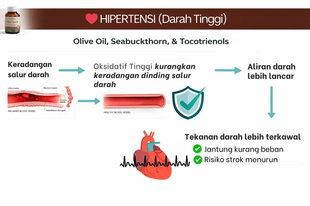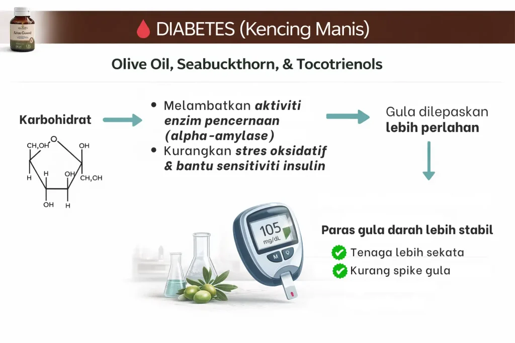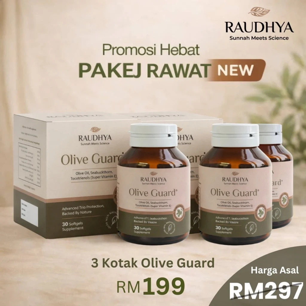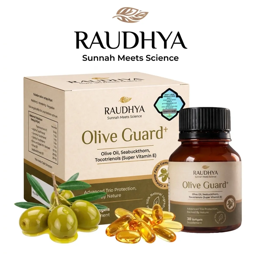 Raudhya OliveGuard+ Diperkaya Bahan Aktif Polyphenols, Tocotrienols (Super Vitamin E) & Omega Aktif Menyokong Kawalan Gula, Kolesterol & Tekanan Darah
